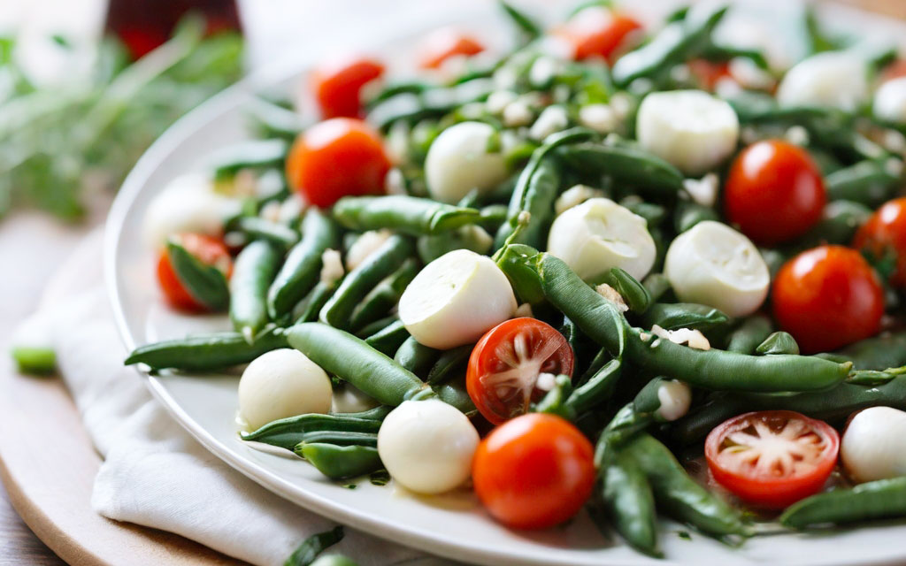 - Servi l’insalata di fagiolini, pomodori e mozzarella come contorno fresco e colorato o come piatto principale leggero.